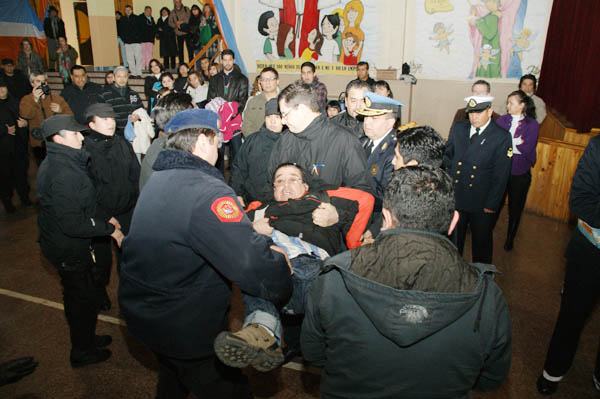 El propietario de la emisora FM América, Ulises Barría, fue detenido antes del inicio del acto por aniversario de la Constitución provincial, en momentos en que mostraba una pancarta donde le exigía a la Gobernadora el cumplimiento de la ley “Gaucho Rivero”.