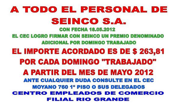 Se trata de un acuerdo entre el CEC y la empresa SEINCO, donde se establece el pago de un “Adicional por Domingo Trabajado”, dentro del marco del Convenio Colectivo de Trabajo Nº 130/75.