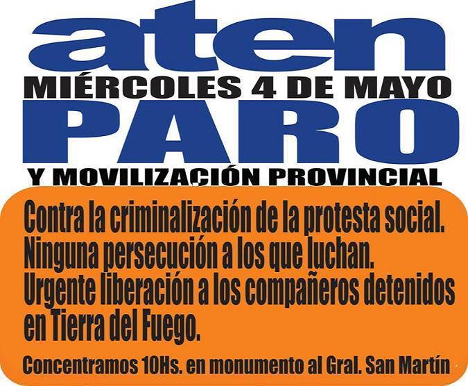 La Asociación de Trabajadores de la Educación de Neuquén (ATEN), resolvió realizar un paro por 24 horas este miércoles 4 de mayo, en repudio a la persecución y detención a dirigentes sindicales de Tierra del Fuego.