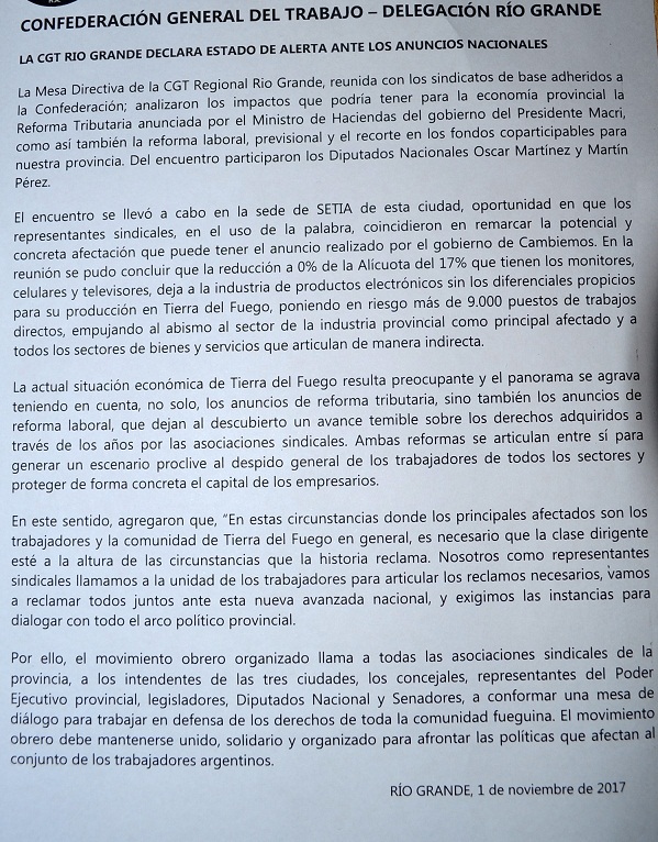 La conferencia de prensa de brindó en la sede del gremio textil SETIA, donde en primer término el Secretario General de esa entidad sindical y uno de integrantes del triunvirato que conduce los destinos de la CGT Regional Río Grande, Mariano Tejeda, leyó el documento que momentos antes terminaron de rubricar los dirigentes sindicales allí presentes.