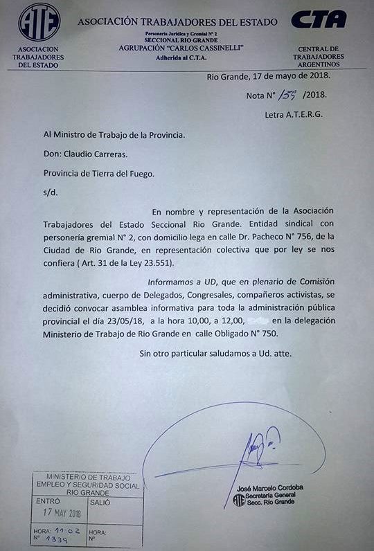 A las 10 horas del miércoles 23 de mayo, ATE ha convocado a los todos los trabajadores estatales provincial y de entes descentralizados, a una asamblea general informativa frente a la Delegación del Ministerio de Trabajo de la provincia en la ciudad de Río Grande.