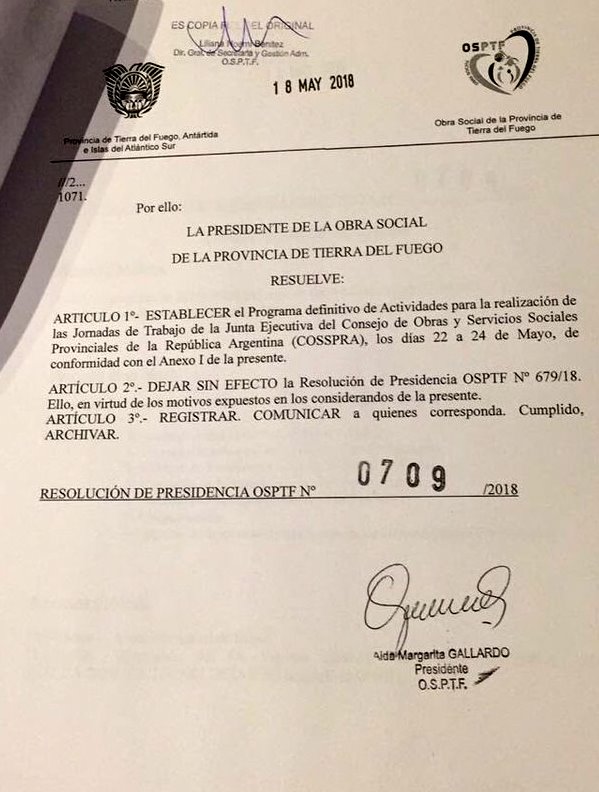 Mientras Bertone manifiesta su “enojo”, la propia Margarita Gallardo firmó al Resolución N° 709/2018, mediante la cual deja sin efecto la Resolución N° 679/2018, con la cual se autorizaba a contratar los servicios de la empresa “VOLVER SRL” por el servicio de “Organización y Catering” de 40 cenas temáticas como fin de jornada del evento COSSPRA, por el monto de $300.000, a razón de $7.500 por persona; pero la Presidente de la OSEF, NO dejó sin efecto la Resolución N° 589/2018, mediante la cual se contrató los servicios del lujoso hotel (5 estrellas) “Arakur Resort & Spa”, por la cifra del $162.270,00.