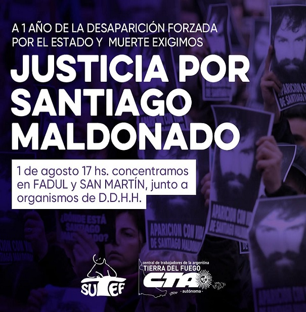 “El Estado es responsable! En Rio Grande todos a la Torre de Agua el 1° de agosto a las 18 horas. Hace un año el Gobierno nacional ejecutó y encubrió la desaparición forzada de Santiago. En Ushuaia, la convocatoria junto a organismos de Derechos Humanos será a las 17 horas en Fadul y San Martín.