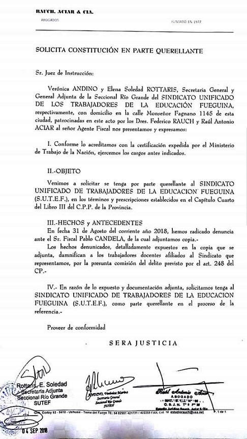 El gremio docente de Tierra del Fuego, SUTEF, presentó una solicitud para actuar como querellante en el proceso judicial referido a la denuncia contra Bertone y Arcando sobre la presunta comisión del delito de malversación de caudales públicos.