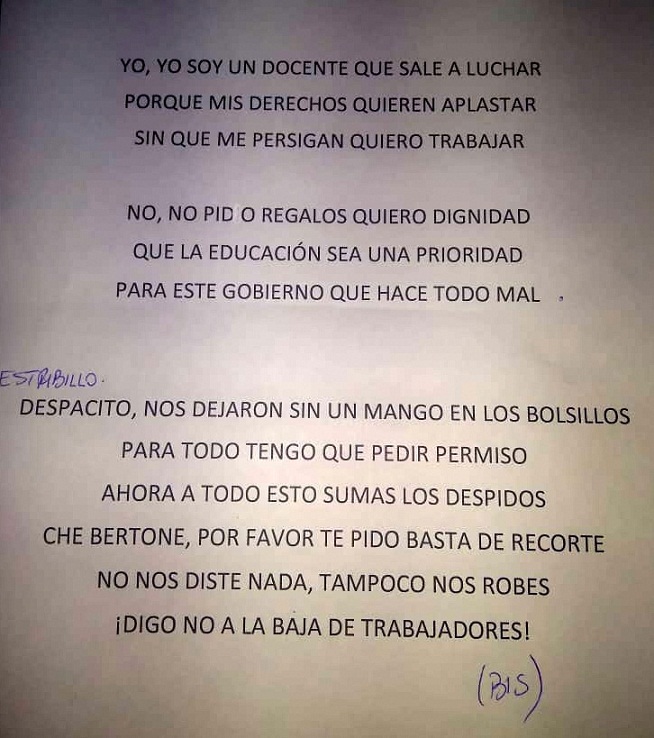 Con la base musical de la canción “Despacito”, los docentes de Tierra del Fuego crearon el “hit musical” dedicado a la Gobernadora Rosana Bertone. “Despacito, nos dejaron sin un mango en los bolsillo, para todo tengo que pedir permiso, ahora a todo esto sumas los despidos”, dice el estribillo de la canción”.