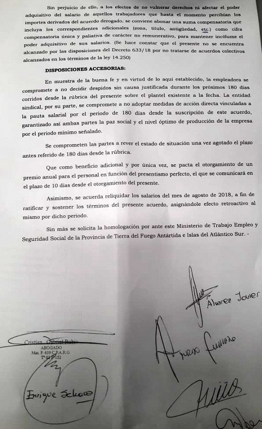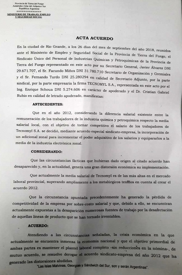 El pasado 26 de setiembre, el sindicato de Químicos y Petroquímicos de Tierra del Fuego firmó un “acuerdo” con la empresa Tecnomyl S.A. dando de baja un acuerdo salarial del año 2012. Los trabajadores percibirán en compensación una suma en “negro”, y los futuros trabajadores tendrán menores salarios.