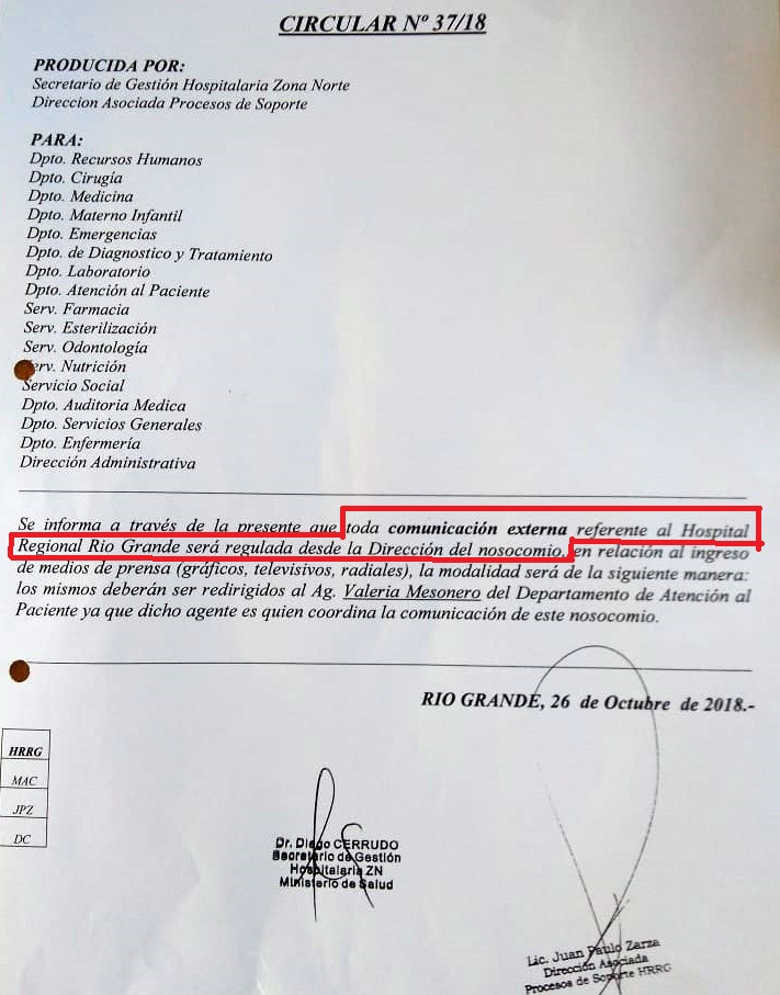 Por otra parte, se conoció la semana pasada que las autoridades del Hospital Regional Río Grade, emitieron la Circular N° 37/18, a la que tuvo acceso "gremialesdelsur", donde se pone en conocimiento a todos los sectores, que toda “comunicación externa” referente al nosocomio, será “regulada” desde la Dirección del mismo. La misma Circular determina que el ingreso de medios de prensa será re dirigido al Departamento de Atención al Paciente, a la Agente Valeria Mesonero, quien coordina la comunicación del nosocomio.