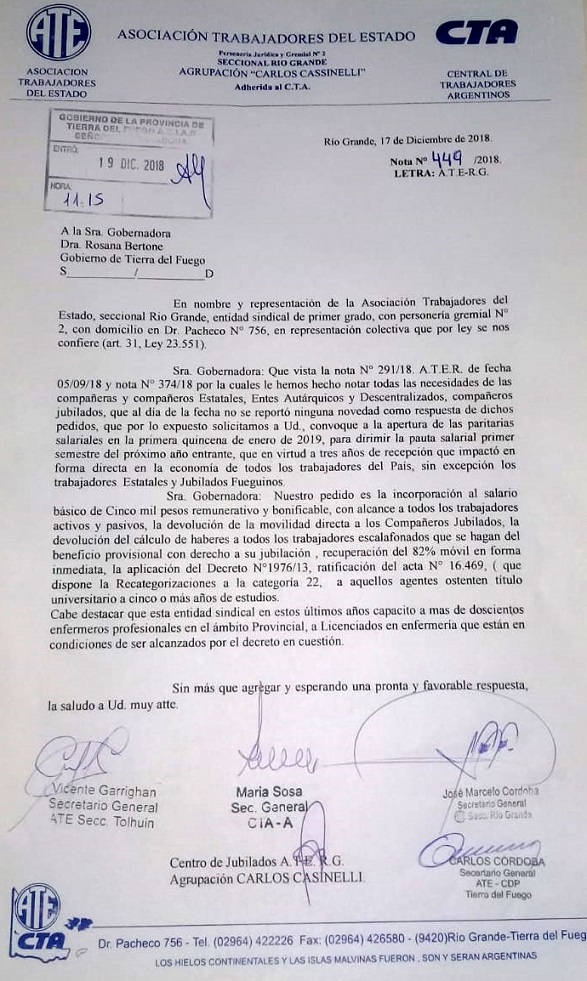 La nota N° 449/2018, Letra ATE-RG, fue presentada este miércoles 19 de diciembre y recuerda que a la fecha la entidad sindical no ha tenido respuestas a las notas presentadas en el mes de setiembre del presente año, donde se puso en conocimiento de todas las necesidad de los trabajadores estatales, de entes autárticos y descentralizados, y jubilados.