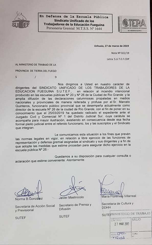 El sindicato docente de Tierra del Fuego, SUTEF, presentó una nota en el Ministerio de Trabajo de la provincia, informando de la presentación judicial realizada al Director de la Escuela N° 26 de Río Grande, Marcelo Alejandro Quinteros, por “daños y perjuicios”.