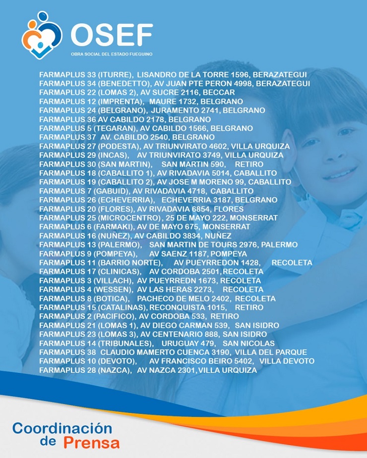 En el marco del Plan de Acción para el Fortalecimiento de la Obra Social del Estado Fueguino (OSEF), la entidad rubricó convenio con 34 nuevas farmacias para ampliar su cobertura para afiliados en tránsito en la Ciudad de Buenos Aires y Gran Buenos Aires.