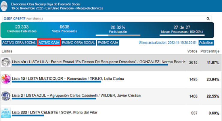 La Lista Lila se impuso en los estamentos OSEF Activos, OSEF Pasivos y Caja Activos; mientras que la Lista Naranja se quedó con el estamento Caja Pasivos. Norma González (Caja Activos) y Patricia Blanco (Caja Pasivos) repetirán mandatos.
