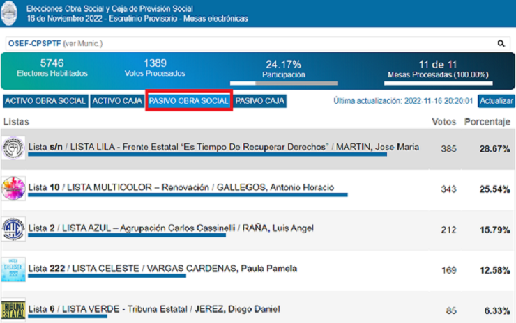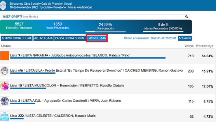 El Frente Estatal “Es Tiempo De Recuperar Derechos” (Lista Lila) se impuso en tres de los cuatro estamentos que estaban en disputa; mientras que la Lista 3, Jubilados Autoconvocados (Lista Naranja) se quedó con el restante.