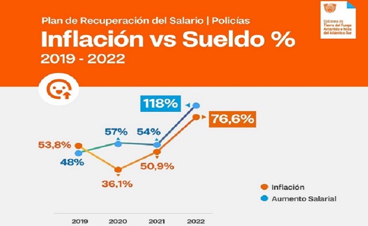 Durante el acto, el Gobernador Melella explicó que, “separando lo político y basándonos en datos reales, cuando asumimos en 2019 el salario básico de un policía estaba entre aproximadamente 31 mil pesos. El aumento salarial de ese año fue un 48%, pero el proceso inflacionario que ya empezaba a crecer fue del 53%, con lo cual el salario empezaba a quedar por debajo de la inflación”.