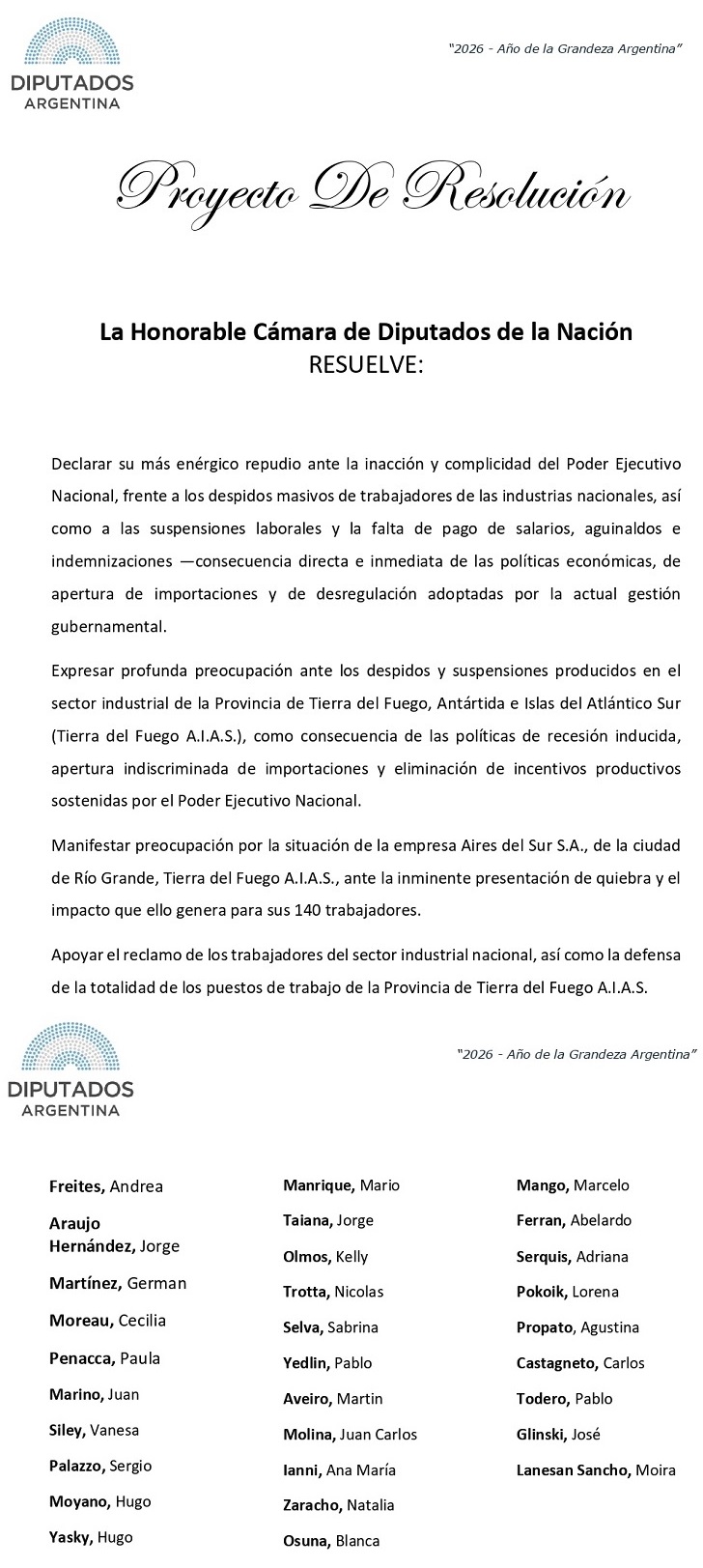 “Con el acompañamiento de Diputadas y Diputados de nuestro bloque de Unión por la Patria, presenté un Proyecto de Resolución para repudiar la grave situación que atraviesan los trabajadores de Aires del Sur y sus familias”, resaltó Andrea Freites y acotó, “desde el inicio del Gobierno de Milei, cerraron más de 21.000 empresas y se perdieron más de 290.000 puestos de trabajo registrados en nuestro país. Detrás de cada número hay familias, historias y comunidades enteras afectadas”.