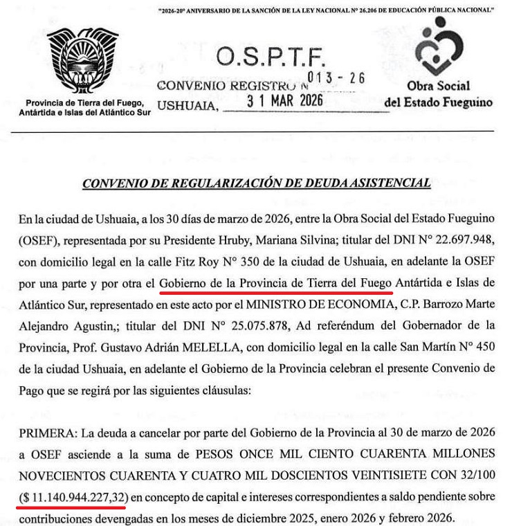 Cabe señalar que los convenios de meción solo son firmados en representación de la OSEF por la Presidenta Mariana Hruby, y tienen la particularidad que ambos son en 36 cuotas; en el caso del convenio con el Gobierno de la provincia el monto es de mas de 11 mil millones de pesos, y en el caso del convenio con el Municipio de Río Grande es por el monto de más de 3 millones y medio de pesos.